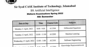 Sir Syed Case Institute of Technology Islamabad Examinations Authority announces to conduct examinations for Sir Syed Case Institute of Technology BS Artificial Intelligence Mid Term Examinations for the Spring of 2022. The examination will begin on April 1, 2022. Syed Case Institute of Technology has published an updated the Sir …
